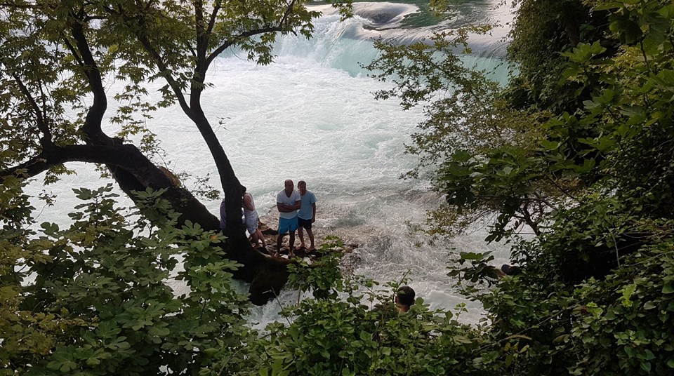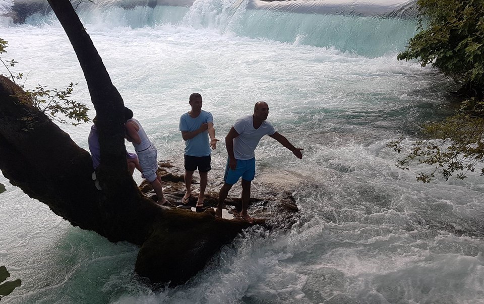 Antalya'da Manavgat Şelalesi'ni gezen 4 kişi, suyun kesilmesini fırsat bilerek ırmak üzerindeki adaya yürüyerek geçti.