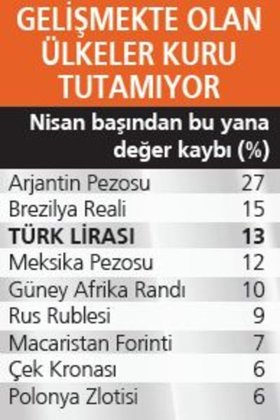 Brezilya Real'inde, Arjantin Pezosu'nda ve Güney Afrika Randı'nda ciddi değer kayıpları görülüyor. Arjantin yüzde 25'lik enflasyona karşın faiz oranını yüzde 40'a çıkarmasına rağmen yine de piyasadaki bozulmayı durduramıyor. Nisan başından bu yana faiz artırımlarına rağmen pezo yüzde 27, TL yüzde 13 değer kaybetti. Merkez Bankası'nın müdahalelerine rağmen realdeki kayıp yüzde 15'i geçti. Rand da yüzde 10 düştü.