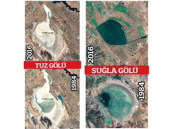 Google Earth uydu görüntülerine göre, 1984 yılından bugüne Burdur Gölü, Acıgöl, Akşehir Gölü, Eber Gölü, Suğla Gölü, Tuz Gölü ve Meke Gölü'nde su seviyesinde ciddi bir düşüş olduğu görülüyor. Meke Gölü'nün tamamen kuruduğu göze çarparken, diğer göllerin de gözle görülür bir şekilde su azlığından küçüldüğü anlaşılıyor.