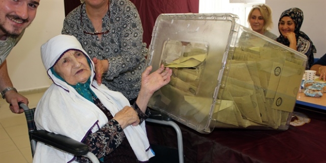 108 yaşındaki Asiye Bekir, Cumhurbaşkanı Recep Tayyip Erdoğan'ı çok sevdiği ve ölmeden önce görme istediği sözleri ile gündeme gelmişti. Asiye nine, bugün öğlen saatlerinde Gürpınar'da bulunan oyunu kullandı. Yakınlarının yardımı ile okula tekerlekli sandalye ile gelen Asiye nine, oy kullanmanın mutluluğunu yaşadığını dile getirerek, hayırlı olmasını diledi. Asiye nineyi okulda gören ve tanıyan vatandaşlar, sevgi gösterisinde bulunarak halini hatırını sordu.