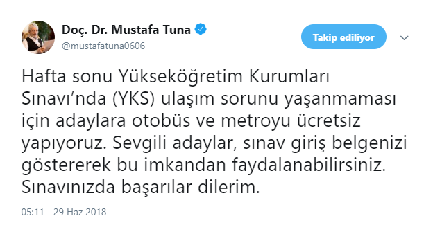 Ankara Büyükşehir Belediye Başkanı Mustafa Tuna: Başkentte toplu taşıma araçlarımızı kullanarak sınava gireceği adrese gitmek isteyen üniversite adaylarımız, sınava giriş belgesini göstererek ücretsiz seyahat edebilecek