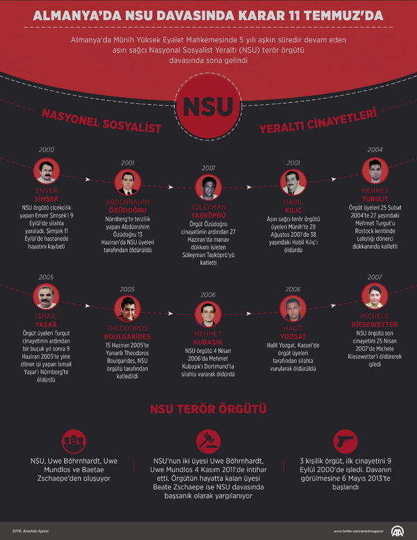 NSU terör örgütü, 2000-2007 yıllarında 8'i Türk 10 kişiyi öldürmek, 2 bombalı saldırı düzenlemek ve 15 banka soygunu yapmakla suçlanıyor. 3 kişilik örgüt, ilk cinayetini 9 Eylül 2000'de işledi. NSU hakkında başlatılan soruşturmada devletin muhbirlerinin NSU üçlüsü ile bağlantılarının gün yüzüne çıkması ülkede deprem etkisi yaptı. Şimdiye kadar 437 duruşmanın olduğu davada 765 tanık ve 56 uzman dinlendi. Davada 93 mağduru 60 avukat temsil etti.