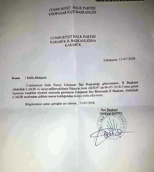 CHP Eskipazar İlçe Başkanı Hüseyin Şahin, parti binasında yaptığı açıklama ile görevinden istifa ettiğini açıkladı. Şahin, CHP Karabük İl Başkanı Abdullah Çakır ile arasında yaşanan sorunu istifa gerekçesi olarak göstererek, "İl Başkanı Abdullah Çakır ve Sayın Milletvekilimiz Hüseyin Avni Aksoy'un 6 Temmuz günü ilçemize teşekkür ziyareti sırasında, parti binasında İl Başkanı Abdullah Çakır tarafından şiddete maruz kaldığımdan dolayı istifa ediyorum" yazılı dilekçesini gösterdi.