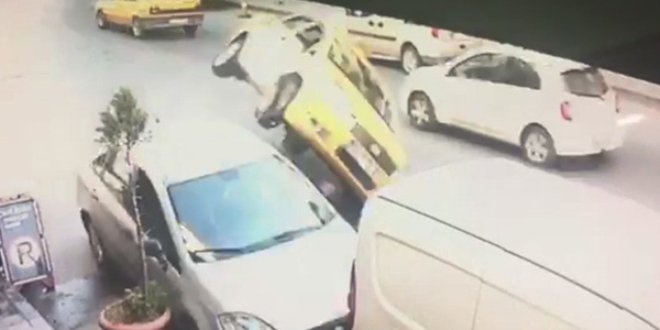 Bağcılar'da kontrolden çıkarak park halindeki araçlara çarpan ticari taksi takla attı. Sürücünün yaralandığı kazada ticari takside yolcu olmaması faciayı önlerken, taksinin adeta şaha kalktığı kaza anları güvenlik kamerasına yansıdı.