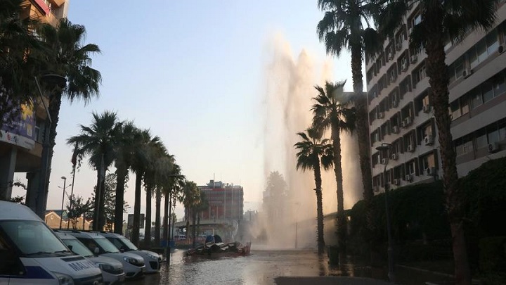 Alınan bilgiye göre, şebeke suyunun aktığı boru, Cumhuriyet Bulvarı'ndaki İZSU ve İzmir Büyükşehir Belediyesine yaklaşık 100 metre mesafede henüz belirlenemeyen nedenle patladı.