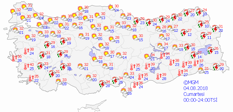 Meteoroloji Genel Müdürlüğü tarafından yapılan son değerlendirmelere göre; Ülkemizin kuzey, iç ve batı kesimlerinin parçalı bulutlu, Trakya, İç Ege, Batı Akdeniz'in iç kesimleri, Doğu Karadeniz kıyıları, Balıkesir, Bursa, Bilecik, Bolu, Eskişehir, Ankara, Ordu, Osmaniye, Konya'nın batı kesimleri, Adana ve Mersin'in kuzey çevreleri ile Hatay'ın kuzey kıyılarının yerel olmak üzere sağanak ve gök gürültülü sağanak yağışlı, diğer yerlerin az bulutlu ve açık geçeceği tahmin ediliyor. Yağışların öğle saatlerinden sonra Bursa'nın güneyi, Uşak, Kütahya ve Afyonkarahisar çevrelerinde yerel olarak kuvvetli (21-50 kg/m2) olması bekleniyor.