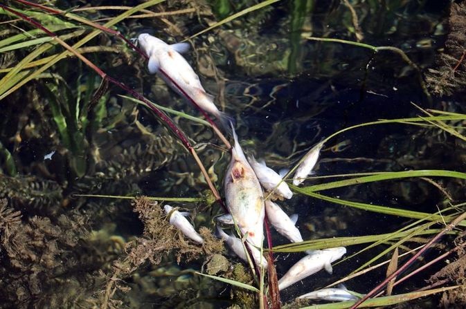 Antalya'nın Konyaaltı ilçesi Akdeniz Kent Parkı yakınındaki bir dere yatağında su üzerinde 200'ün üzerinde irili ufaklı sazan balığı ölü halde bulundu.