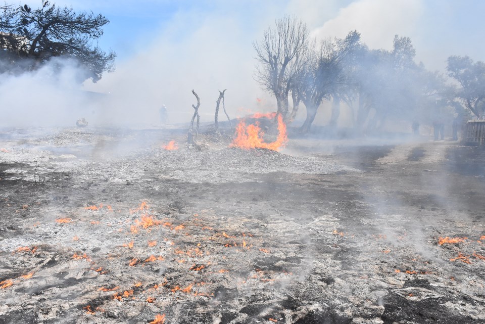 Arazide bulunan asırlık zeytin ve çam ağaçları ile bir deponun zarar gördüğü yangın, ekiplerin yoğun mücadelesi sonucu kontrol altına alındı.