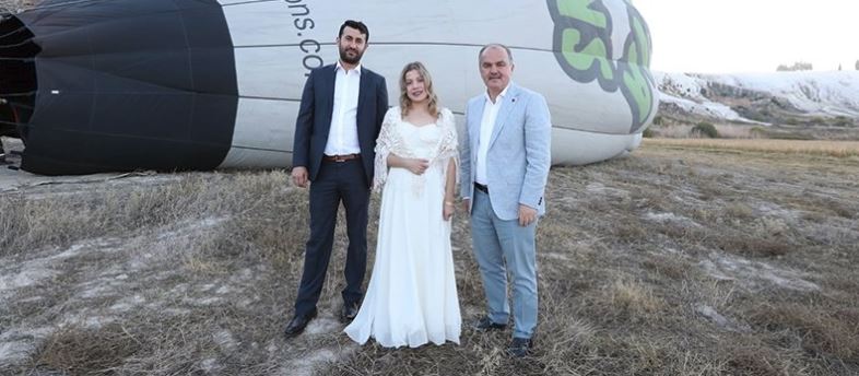 Balon sepetinde şahitlerin huzurunda kıyılan nikah sonrası Gürlesin, evlilik cüzdanını Elif Kayaoğlu'na teslim ederek genç çifte ömür boyu mutluluk diledi.