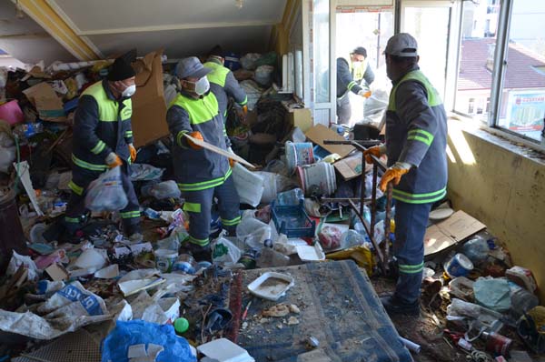 Buraya çağrılan Belediye Temizlik İşleri Müdürlüğü ekipleri, evde temizlik çalışması yaptı. Evden yaklaşık 8 kamyon çöp çıkartan ekipler, daha sonra odaları dezenfekte etti.
