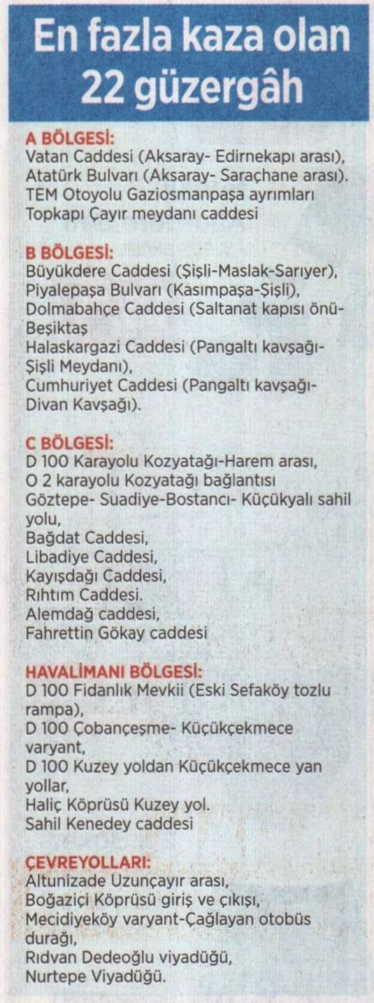 Türkiye genelinde ölümlü kazalar sıralamasında ilk sırada yer alan İstanbul'da trafikte can ve mal kaybına neden olan olayların yüzde 70'inin aynı güzergahta olduğu saptandı. Yetkililer "kara nokta" denilen 22 güzergah belirledi.