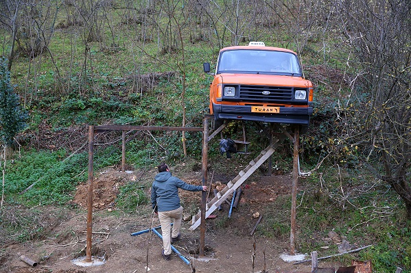 "Minibüsün durumu çok kötüydü. Üzerindeki pasta ve boya işlemlerini ben kendim gerçekleştirdim. Güzel görünmesi için dışarısında bir iki düzeltme yaptık. Daha sonra minibüsü havada tutacak olan demir direkleri araziye betonla yerleştirdik. Direkler arasındaki bağlantıyı da kaynaklarla gerçekleştirdik. Son olarak da vinç getirdik ve onun yardımıyla minibüsü direklerin üzerine koyduk."