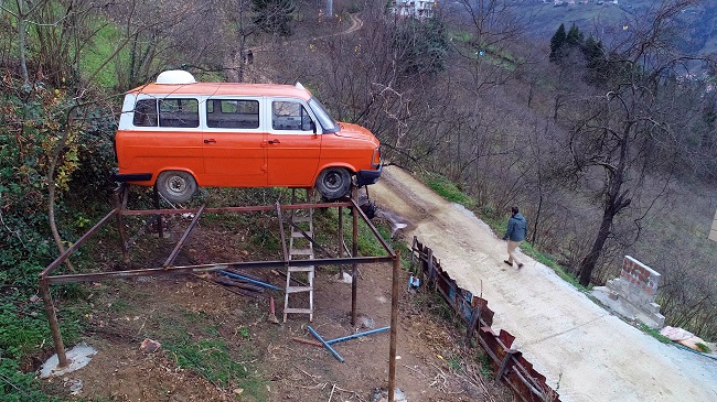 Trabzon'da yaşayan iki kardeş, inşa ettikleri demir direklerin üzerine yerleştirdikleri hurda minibüs ile evlerinin karşısındaki arazide "seyir terası" kurdu