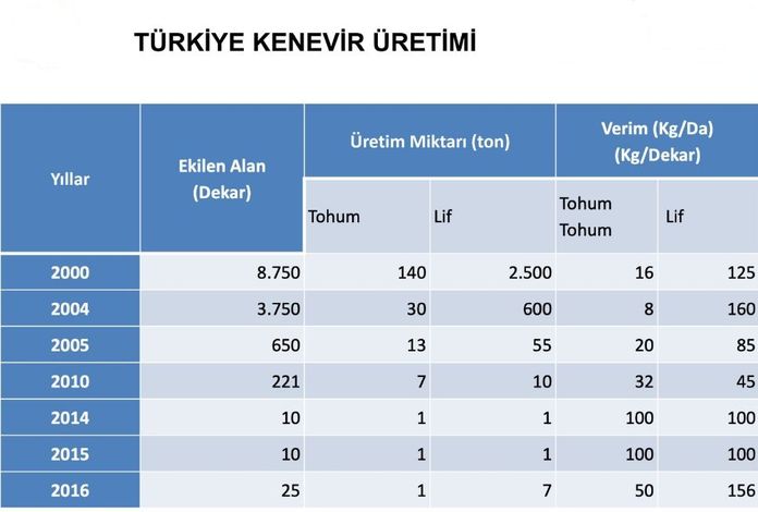 Türkiye İstatistik Kurumu (TÜİK) verilerine göre, 1988 yılında bin tondan daha fazla olan kenevir tohumu üretimi, 2013'ten beri 1 ton seviyesinde gerçekleşiyor. Ekilen alanlara bakıldığında ise, 2017 yılında 24 dekarlık alanda kenevir ekimi gerçekleştirildiği görülüyor. TÜİK verilerine göre, kenevirin üretim verimliliği 1988'de 35 kg/dekar iken, bu değerin 2017'de 42 kg/dekar'a yükseldiği anlaşılıyor.