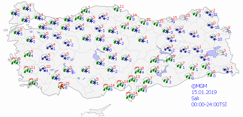 Meteoroloji Genel Müdürlüğü tarafından yapılan son değerlendirmelere göre; Ülke genelinin parçalı ve çok bulutlu; Marmara'nın doğusu, Batı Akdeniz, İç Anadolu'nun kuzeyi, Batı Karadeniz, Orta ve Doğu Karadeniz'in iç kesimleri, Doğu ve Güneydoğu Anadolu ile Kütahya, Muğla, Hatay, Osmaniye, Konya, Nevşehir, Aksaray ve Samsun, çevrelerinin yağışlı geçeceği tahmin ediliyor. Kıyı kesimlerde yağmur ve sağanak, Karadeniz'in iç kesimleri, İç Anadolu'nun yağış alan kesimleri ve Doğu Anadolu ile Burdur ve Isparta'da karla karışık yağmur ve kar şeklinde olması beklenen yağışların Antalya çevrelerinde kuvvetli sağanak ve gök gürültülü sağanak, Isparta'nın güneyi ve Burdur'un doğu ilçelerinde yer yer kuvvetli karla karışık yağmur, öğle saatlerinden sonra Hakkari çevrelerinde yoğun kar yağışı şeklinde olması bekleniyor. İç ve doğu kesimlerde buzlanma ve don olayı ile birlikte yer yer pus ve sis olayı bekleniyor.