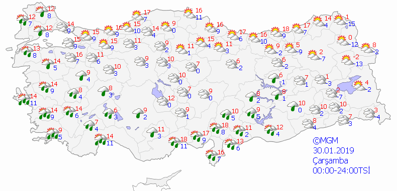 Meteoroloji Genel Müdürlüğü tarafından yapılan son değerlendirmelere göre; Ülkemiz genelinin parçalı ve çok bulutlu, Kıyı Ege, Batı Akdeniz, Doğu Anadolu'nun doğusu (Ardahan hariç) ile Edirne, Kırklareli ve Çanakkale çevrelerinin yağışlı geçeceği tahmin ediliyor. Yağışların; genellikle yağmur ve sağanak, yer yer gök gürültülü sağanak, Kars, Bitlis, Hakkari, Van ve Ağrı çevrelerinde kar şeklinde olması bekleniyor. Bu sabah saatlerinde iç ve doğu kesimlerde yer yer sis ve pus hadisesi bekleniyor. Doğu Anadolu bölgesinin güneydoğu kesimlerinde çığ tehlikesi bulunmaktadır.