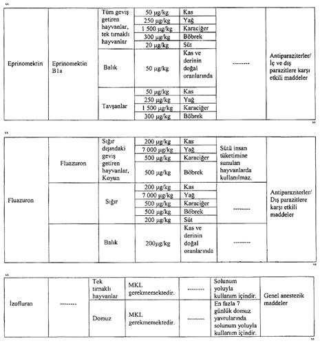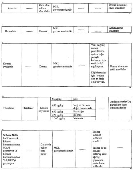 MADDE 1 - 7/3/2017 tarihli ve 30000 sayılı Resmi Gazete'de yayımlanan Türk Gıda Kodeksi Hayvansal Gıdalarda Bulunabilecek Farmakolojik Aktif Maddelerin Sınıflandırılması ve Maksimum Kalıntı Limitleri Yönetmeliğinin EK-1'indeki Hayvansal Gıdalarda Bulunabilecek Farmakolojik Aktif Maddelerin Sınıflandırılması ve Maksimum Kalıntı Limitleri başlıklı Bölüm-1'de yer alan İzinli Maddeler listesindeki Eprinomektin, Fluazuron ve İzofluran isimli aktif maddelere ait satırlar aşağıdaki şekilde değiştirilmiş ve aynı listede yer alan "Alanin" satırından sonra gelmek üzere "Alarelin", "Borik asit ve boratlar" satırından sonra gelmek üzere "Bromelain", "Doksisiklin" satırından sonra gelmek üzere "Domuz Prolaktin", "Fluniksin" satırından sonra gelmek üzere "Fluralaner", "Solidago virgaurea" satırından sonra gelmek üzere "Solvent Nafta" isimli aktif maddelere ait aşağıdaki satırlar eklenmiştir.