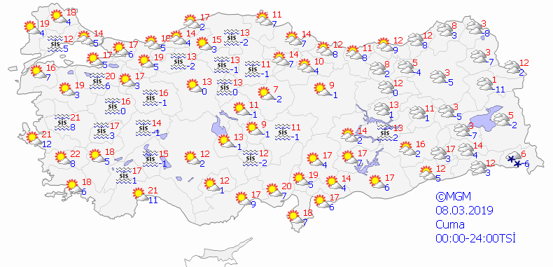 Meteoroloji Genel Müdürlüğü tarafından yapılan son değerlendirmelere göre; Akdeniz, İç Anadolu'nun güney kesimleri, Doğu Anadolu'nun güneyi, Güneydoğu Anadolu bölgeleri ile Muğla, Denizli, Uşak, Afyonkarahisar, Erzurum, Ağrı ve Iğdır çevrelerinin yağışlı geçmesi bekleniyor. Yağışların; genellikle yağmur ve sağanak, Muğla çevreleri ve Akdeniz'in kıyı kesimlerinde yer yer gök gürültülü sağanak, Doğu Anadolu'nun doğusunda yer yer karla karışık yağmur ve kar şeklinde olacağı tahmin ediliyor. İç ve doğu kesimlerde buzlanma ve don olayı bekleniyor.