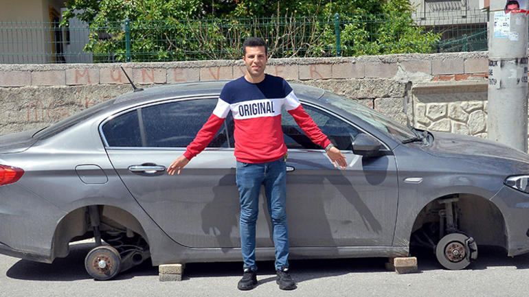 Polisler geldi fotoğraflarını çekti. Araç bu halde. İlk duyduğumda şaşırdım, 'Nasıl olur?' dedim. İlk başta kardeşim şaka yapıyor sandım. 2 lastik yerinde, diğer 2'sini söküp götürmüşler.