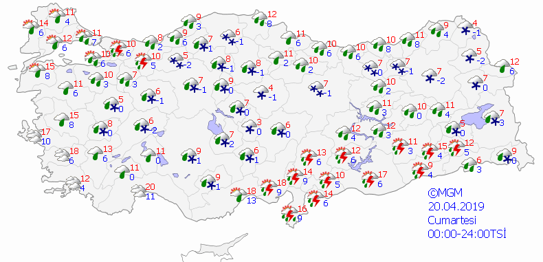 Meteoroloji Genel Müdürlüğü tarafından yapılan son değerlendirmelere göre; Ülkemiz genelinin parçalı ve çok bulutlu, Kıyı Ege ile Antalya ve Konya dışında tüm bölgelerin yağışlı geçeceği tahmin ediliyor. Yağışların; genellikle yağmur ve sağanak, Orta ve Doğu Akdeniz, Güneydoğu Anadolu ile Kocaeli ve Sakarya çevrelerinin yer yer gök gürültülü sağanak, İç Anadolu, Batı ve Doğu Karadeniz'in iç kesimleri, Doğu Anadolu'nun kuzey ve doğusu ile Kütahya, Afyonkarahisar ve Isparta çevrelerinin karla karışık yağmur ve kar yağışlı olması bekleniyor.