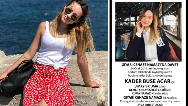 20 yaşındaki Kader Buse Acar'ı kaybolduğu 24 Ocak'tan bu yana Ağva Deresi'nde, karada ve denizde jandarma, sahil güvenlik, deniz polisi, resmi ve özel kuruluşların sivil toplum kuruluşlarının aramaları sonuç vermeyince, anne-babası gıyabi cenaze namazı kıldırma kararı alarak duyuru yayınladı.
