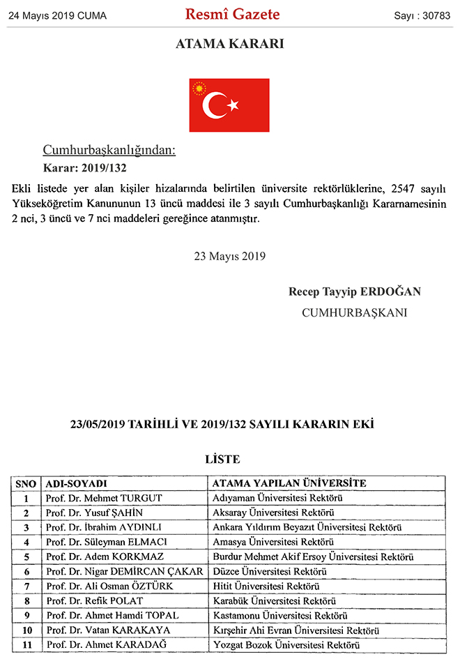 Cumhurbaşkanı Erdoğan söz konusu atamaları 2547 sayılı Yükseköğretim Kanunu'nun 13. ve 3 sayılı Cumhurbaşkanlığı Kararnamesi'nin 2. 3. ve 7. maddeleri gereğince yaptı.