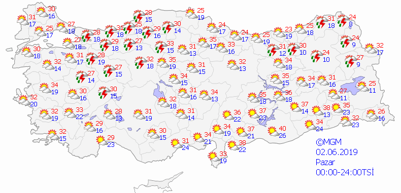 Meteoroloji Genel Müdürlüğü tarafından yapılan son değerlendirmelere göre; Ülkemiz genelinin az bulutlu ve açık, zamanla kuzey ve iç kesimlerinin yer yer parçalı ve çok bulutlu, Eskişehir'in güney kesimleri, Çankırı ile öğle saatlerinden sonra Konya, Kastamonu, Sinop'un iç kesimleri, Çorum, Amasya, Niğde, Doğu Akdeniz'in Toroslar mevkii, Çankırı'nın kuzey kesimlerinin yerel ve kısa süreli sağanak ve gök gürültülü sağanak yağışlı, diğer yerlerin az bulutlu ve açık geçeceği tahmin ediliyor.