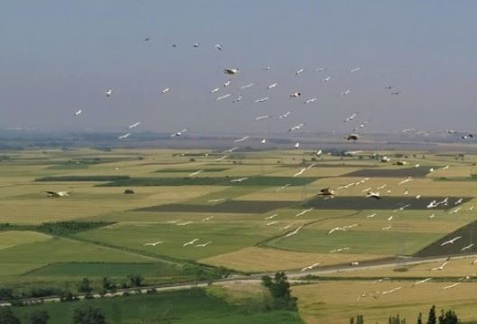 Ak pelikanların göç yolları ve konaklama yerleri arasında bulunan Bursa'nın Karacabey ilçesinin semaları kuşların dansına sahne oldu. Bu güzel anlar havadan da görüntülendi.