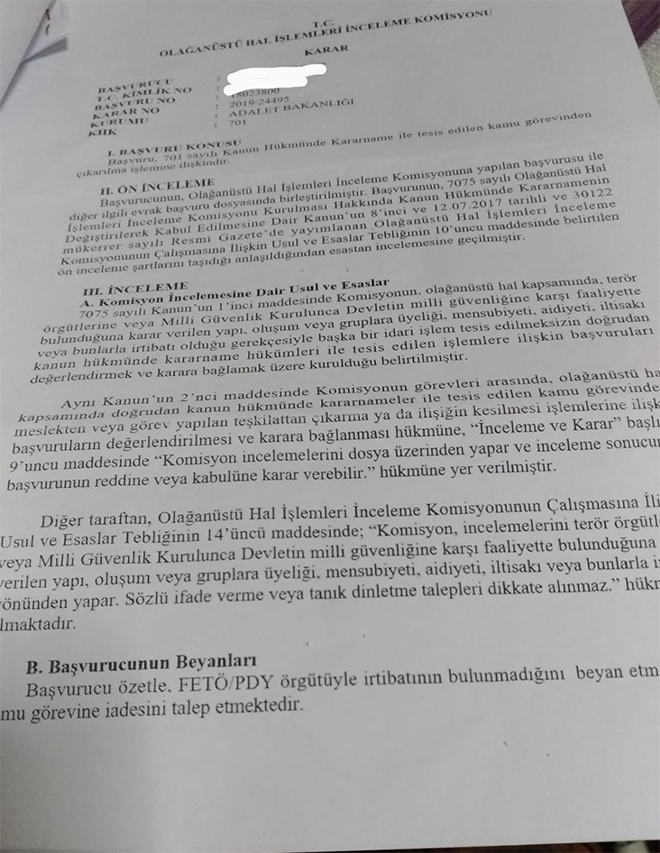 OHAL Komisyonu, kişiyle ilgili olarak yapılan yargılamada Beraat kararını da gözönüne alaraki ihraç edilen başvurunu kabul etmiş ve göreve iade kararı vermiştir.