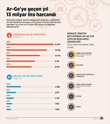 Merkezi yönetim bütçesi üzerinden gerçekleştirilen hesaplamalara göre, Ar-Ge için geçen yıl bir önceki yıla göre yüzde 21,6 artışla 13 milyar 24 milyon lira harcama yapıldı. Böylece 2018 merkezi yönetim bütçesinden Ar-Ge faaliyetleri için gerçekleştirilen harcamaların Gayrisafi Yurtiçi Hasıla içindeki oranı yüzde 0,35, merkezi yönetim bütçe harcamaları içindeki payı ise yüzde 1,4 oldu.