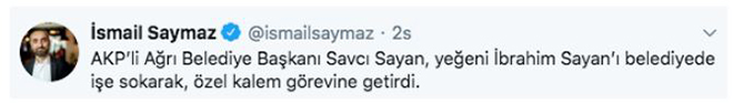 Twitter'da gazeteci İsmail Saymaz'ın AK Parti'li Ağrı Belediye Başkanı Sayan'ı suçlayan ifadeleri ikili arasında gerilime neden oldu. Saymaz ilk olarak "AK Parti'li Ağrı Belediye Başkanı Savcı Sayan, yeğeni İbrahim Sayan'ı belediyede işe sokarak, özel kalem görevine getirdi" dedi.