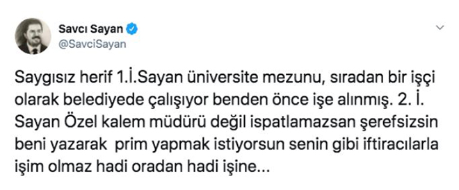 Saymaz'ın iddiasına Sayan'da yanıt geldi. "Saygısız herif" diye söze giren Sayan, "İbrahim Sayan üniversite mezunu, sıradan bir işçi olarak belediyede çalışıyor benden önce işe alınmış. İbrahim Sayan özel kalem müdürü değil ispatlamazsan şerefsizsin beni yazarak prim yapmak istiyorsun senin gibi iftiracılarla işim olmaz hadi oradan hadi işine" ifadesini kullandı.