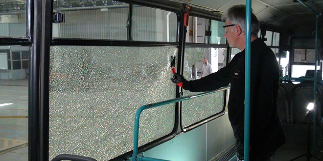 Otobüs camları kırılarak test edilen ''Darp exit - İmdat acil çıkış kolu'' yüzde yüz başarı sergiledi.