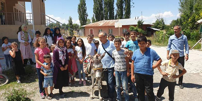 Almanya'da yaşayan Ersin Bilge, çocukluk hayalini gerçekleştirmek için 27 yıl sonra doğduğu ilçeye gelip eşek sırtında köy köy dolaşarak, çocuklara kitap ve kırtasiye malzemesi dağıtıp mutluluklarına ortak oldu.