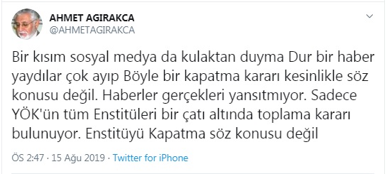 Ahmet Ağırakça'nın yaptığı paylaşım şu şekilde: Bir kısım sosyal medya da kulaktan duyma Dur bir haber yaydılar çok ayıp Böyle bir kapatma kararı kesinlikle söz konusu değil. Haberler gerçekleri yansıtmıyor. Sadece YÖK'ün tüm Enstitüleri bir çatı altında toplama kararı bulunuyor. Enstitüyü Kapatma söz konusu değil