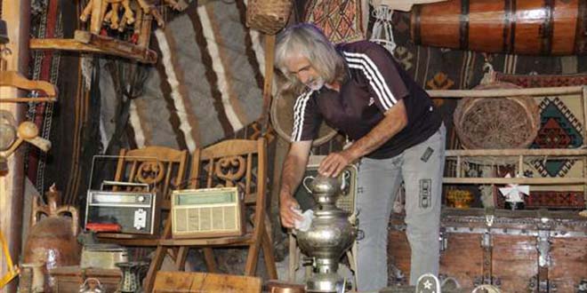 Yozgat'ın Aydıncık ilçesi Ağıllı köyünde yaşayan emekli polis memuru Erdal Ertuğrul, babadan kalma evinde, aralarında yayık, gramofon, radyo ve tarım aletlerinin de bulunduğu eski eşyaları sergiliyor