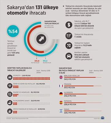Türkiye'nin otomotiv ihracatında lokomotif şehirleri arasında yer alan Sakarya, yılın 7 ayında 131 ülkeye 3 milyar 150 milyon 626 bin dolarlık dış satım gerçekleştirdi. Ocak-temmuz döneminde en çok ihracat 341 milyon 528 bin dolarla Birleşik Krallık'a yapıldı