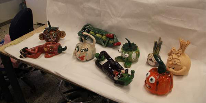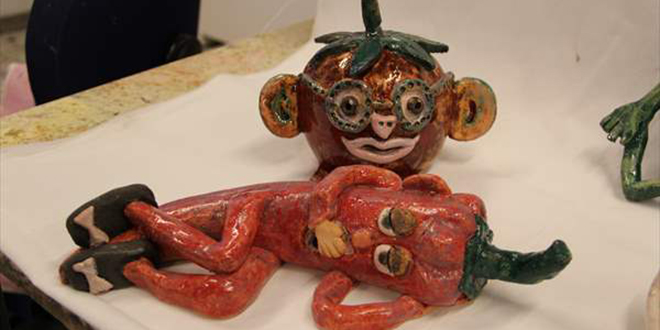 Gaziantep Büyükşehir Belediyesi Sanat Merkezi'nde devam eden seramik kursuna katılan çocuklar, "GastroAntep Uluslararası Gaziantep Gastronomi Festivali" kapsamında şehrin ünlü sebze ve meyvelerinin küçük heykellerini yaptı. Çocukların yaptığı endişeye kapılan patlıcan, şaşıran domates, yan gelip yatan bezelye gibi seramik heykeller, 12-15 Eylül'deki festivalde sergilenecek