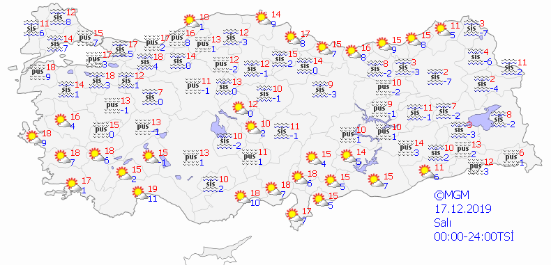 Meteoroloji Genel Müdürlüğü tarafından yapılan son değerlendirmelere göre: Yurt genelinde yağış beklenmiyor. Yurdun kuzeydoğu kesimlerinin parçalı bulutlu, diğer yerlerin az bulutlu ve açık geçeceği tahmin ediliyor. Marmara ile iç ve doğu kesimlerinde yer yer pus ve sis hadisesi bekleniyor.