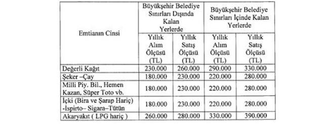(2) Buna göre, anılan maddelerin ticaretini yapanların, 2020 takvim yılında da basit usulden yararlanabilmeleri için alış, satış veya hasılatlarının 31/12/2019 tarihi itibarıyla aşağıda belirtilen hadleri aşmaması gerekmektedir: