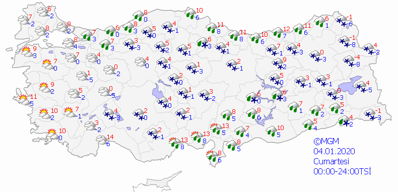 Meteoroloji Genel Müdürlüğü tarafından yapılan son değerlendirmelere göre: Ülkemiz genelinin parçalı ve çok bulutlu, Marmara'nın doğusu, Doğu Akdeniz, İç Anadolu, Batı ve Orta Karadeniz, Doğu Karadeniz kıyıları ile Balıkesir, Muğla, Antalya, Isparta, Gaziantep ve Kilis çevrelerinin yağışlı geçeceği tahmin ediliyor. Yağışların; genellikle yağmur ve sağanak, Batı Karadeniz'in iç kesimleri, İç Anadolu'nun güney ve doğusu ile Kütahya, Afyonkarahisar, Isparta ve Tokat çevrelerinde karla karışık yağmur ve yer yer kar şeklinde olması bekleniyor.