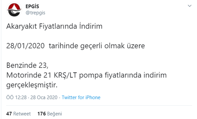 EPGİS'in Twitter'dan yaptığı açıklayama göre; "Akaryakıt Fiyatlarında İndirim 28/01/2020tarihinde geçerli olmak üzere Benzinde 23, Motorinde 21 KRŞ/LT pompa fiyatlarında indirim gerçekleşmiştir." denildi.