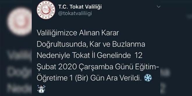 Tokat Valiliğinin sosyal medya hesapları taklit edilerek il genelinde okullarda kar yağışı nedeniyle eğitime ara verildiği ilan edildi. Birçok medya kuruluşu sahte hesapla yapılan paylaşımı gerçek sanarak yayın organlarına taşıyınca Valilikten yalanlama geldi.