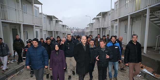 Soylu, evleri depremden dolayı hasarlı olduğu için yıkılan vatandaşların barınma ihtiyacını karşılamak için Doğukent ve Kırklar mahallelerinde tamamlanma aşamasında olan konteyner alanlarında incelemelerde bulundu, yürütülen çalışmalara ilişkin ilgililerden bilgi aldı.