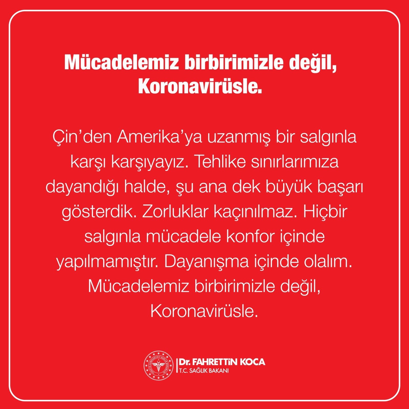 Sağlık Bakanı Fahrettin Koca sosyal medya hesabından yaptığı paylaşımda, "Çin'den Amerika'ya uzanmış bir salgınla karşı karşıyayız. Tehlike sınırlarımıza dayandığı halde, şu ana dek büyük başarı gösterdik. Zorluklar kaçınılmaz. Hiçbir salgınla mücadele konfor içinde yapılmamıştır. Dayanışma içinde olalım. Mücadelemiz birbirimizle değil, korona virüsle" dedi.