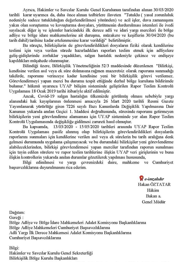Süresinde rapor teslimi yapamayan bilirkişilere yeni görev verilememektedir. Adalet Bakanlığı Hukuk İşleri Genel Müdürlüğü, Covid-19 salgını kapsamında yaşanan sorunu aşabilmek için Uyap'taki Rapor Teslim Kontrol Uygulamasını pasife aldığını duyurdu