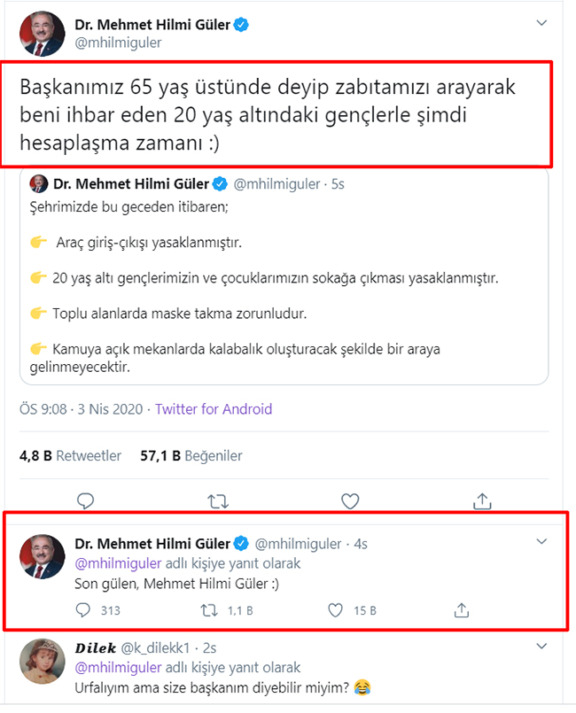 Başkan Güler attığı twette; ''Başkanımız 65 yaş üstünde deyip zabıtamızı arayarak beni ihbar eden 20 yaş altındaki gençlerle şimdi hesaplaşma zamanı :)'' ifadelerini kullanarak tebessüm ettirdi. Güler'in son mesajı ise, 'Son gülen Mehmet Hilmi Güler' oldu.