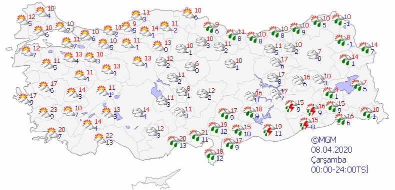 Meteoroloji Genel Müdürlüğü tarafından yapılan son değerlendirmelere göre; ülkemiz genelinin parçalı ve çok bulutlu, Marmara, Ege, Batı Akdeniz, İç Anadolu'nun kuzey ve batısı, Karadeniz ve Doğu Anadolu(Malatya hariç)ile Kırşehir, Yozgat ve Sivas çevrelerinin yağmur ve sağanak yağışlı geçeceği tahmin ediliyor. Yağışların; Edirne, Kırklareli, Tekirdağ, Çanakkale ve İstanbul'un Avrupa Yakası ile Balıkesir'in kuzey kesimlerinde kuvvetli, Güney ve İç Ege'de yer yer gök gürültülü sağanak şeklinde olması bekleniyor.