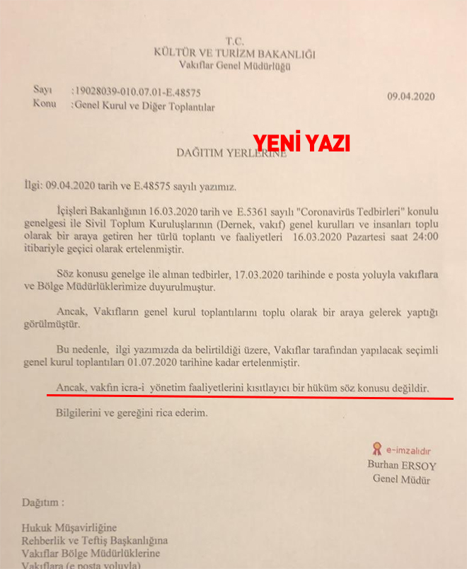 Ancak gelen tepkiler üzerine resmi yazı gece yarısına doğru çekildi. Yeni yazıda, vakıfların icrai faaliyetlerine yönelik bir kısıtlamanın olmadığına yer verilmiştir.