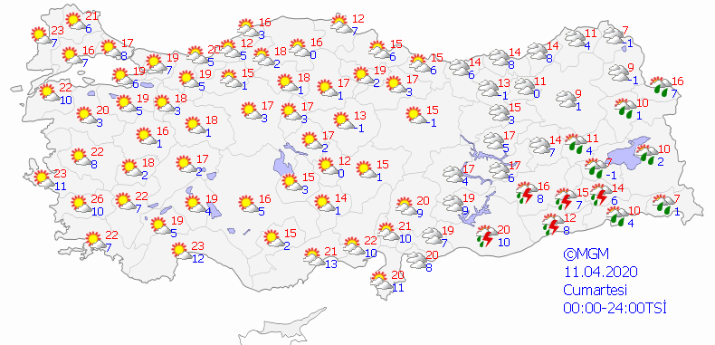 Meteoroloji Genel Müdürlüğü tarafından yapılan son değerlendirmelere göre; ülkemizin doğu kesimlerinin çok bulutlu, Doğu Karadeniz kıyıları, Doğu Anadolu'nun güneydoğusu, Güneydoğu Anadolu'nun doğusu ile Muş, Ağrı, Iğdır ve Şanlıurfa çevrelerinin sağanak ve yer yer gök gürültülü sağanak yağışlı, diğer yerlerin parçalı ve az bulutlu geçeceği tahmin ediliyor.